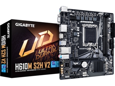 Moderkort, storlek: Micro-ATX, Intel LGA1700 socket, Intel H610 chipset, 1 x PCI-Express 4.0 x16, Dual DDR5-5600 2 x DIMM slots (Intel XMP support), lagringsportar: 4 x SATA-600 / 1 x M.2 NVMe PCI-Express 3.0 (M.2 size: 2242 / 2260 / 2280), USB 3.2 Gen 1 type A, skärmanslutning: 1 x HDMI 2.1 / 1 x VGA, Realtek 1 Gigabit nätverk (LAN), Intel Xe Graphics stöds (CPU med VGA krävs), Realtek HD Audio (8-kanaler) ljudkort, Gigabyte Fusion RGB 2.0 software
